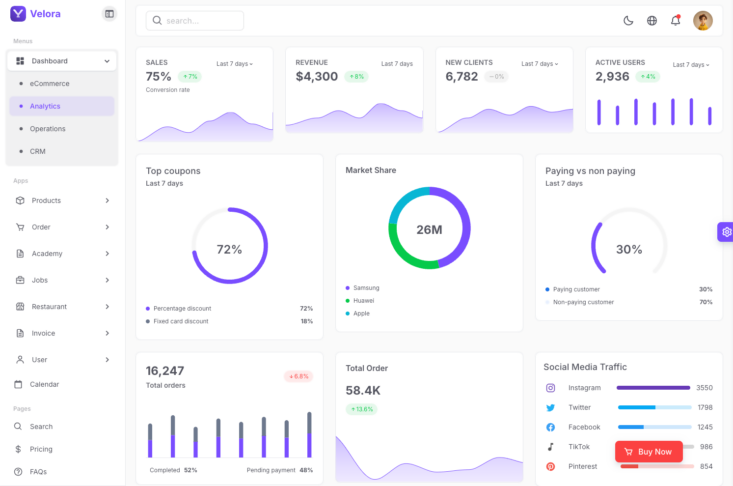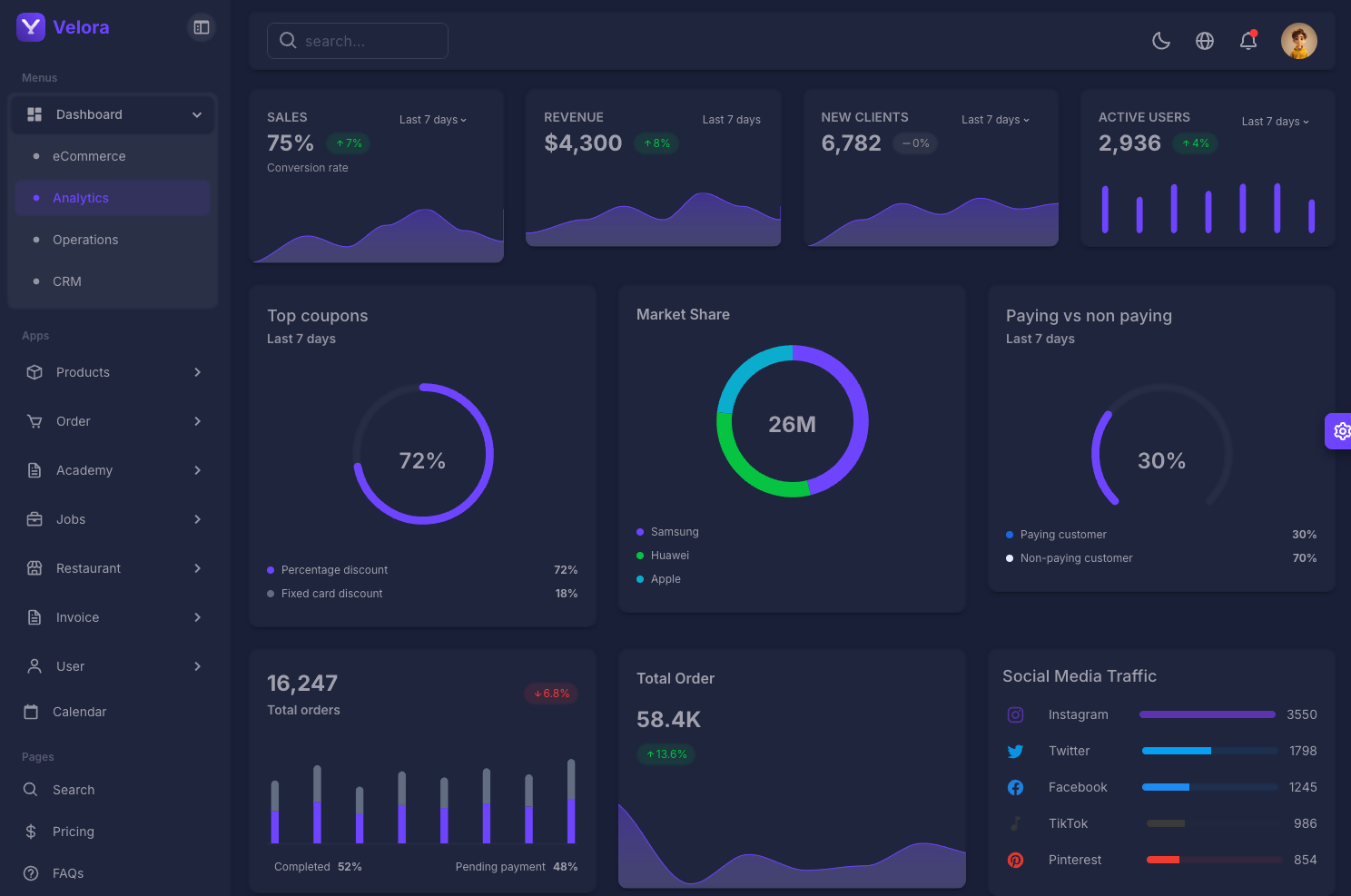 Velora delivers the essential features you need to develop modern web apps while keeping the design clean and lightweight. Key highlights include: